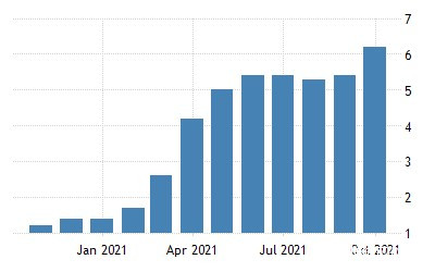 但現在這個文字遊戲也玩不下去了。美國的12個月通脹率(同比CPI增長率)已經6.2%了,為1990年11月以來最高位。這輪通脹也是全面的,尤其是能源領域,汽油達到49.6%,住房達到3.5%,食品5.3%,汽車9.8%,二手車26.4%,交通4.5%,衣服4.3%,藥品1.7%。而且通脹居高不下的趨勢很頑固,僅9月到10月,又是0.9%的CPI環比增長。
