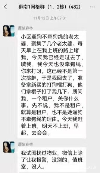 今年9月份,極度害怕狗的盧某林在小區裏遇到了一名遛狗的老太太。老太太並沒有給自己的泰迪狗牽繩,小狗便向盧某林跑去。盧某林撿起路邊的木棍驅趕後和老太太結下了樑子。此後,小區裏幾位養狗的老太太便多次帶狗在盧某林上班路上圍堵。盧某林曾向物業反映該情況卻沒有效果。11月12日,盧某林在小區微信羣表示要“以死抗爭”,次日便自殺身亡。