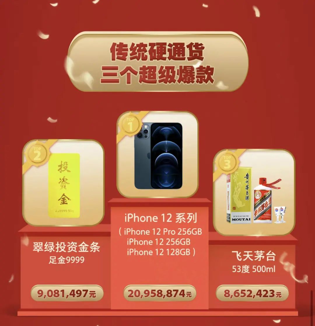 更誇張的是,還有場次完全靠這三樣硬通貨撐場面。據交個朋友官方發佈的戰報,今年7月17日的一場直播支付金額破億,三大“王牌”是金條 (GMV 908萬元) 、iPhone 12 (GMV 2096萬元) 、飛天茅台 (GMV 865萬元) 。三款商品的GMV將近4000萬。