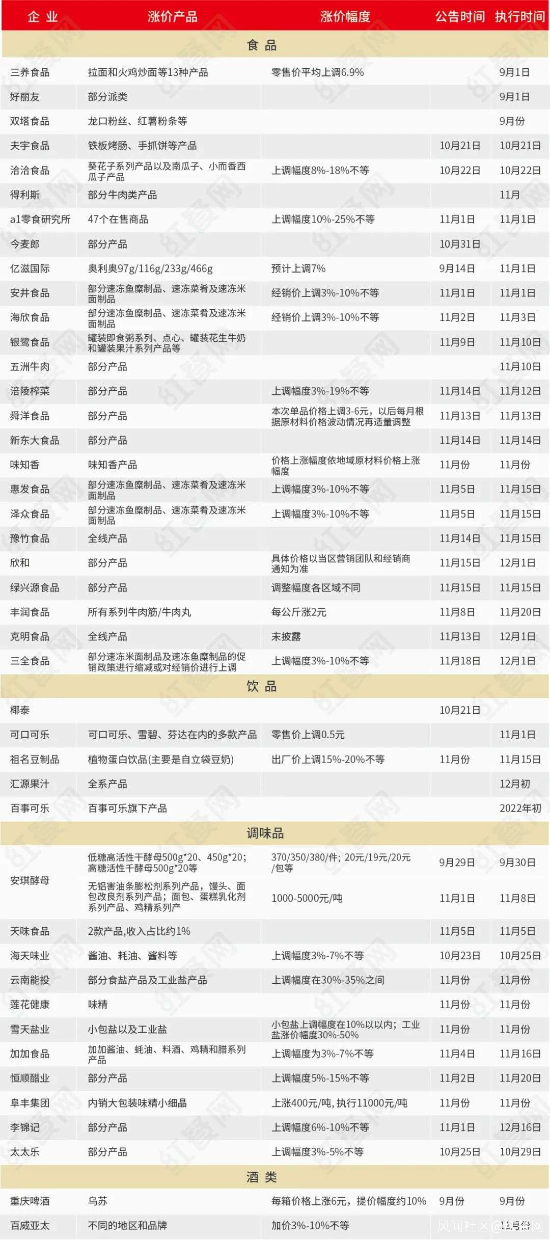 據不完全統計,僅今年9-11月,宣佈漲價的企業超過40家,覆蓋調味品、速凍食品、休閒零食與乳製品等領域。