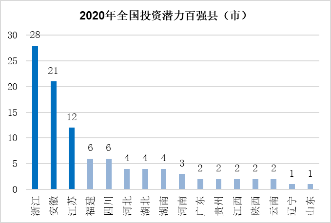 從中國社會科學院財經戰略研究院2020年公佈的全國綜合競爭力百強縣(市)來看,浙江、江蘇分別以24個縣(市)、23個縣(市)佔據了前兩名,加上安徽擁有3個全國綜合競爭力百強縣(市),三省佔比達到了50%。