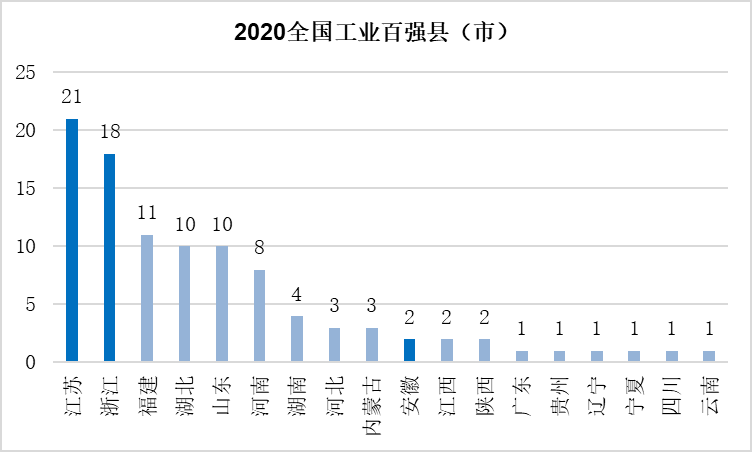 **在長三角發達的縣域經濟中,工業的發展是強大的支撐力。**同樣在2020年的全國工業百強縣(市)數量中,江蘇、浙江佔據了前2名,加上安徽的2個縣(市),佔比就達到了41%。