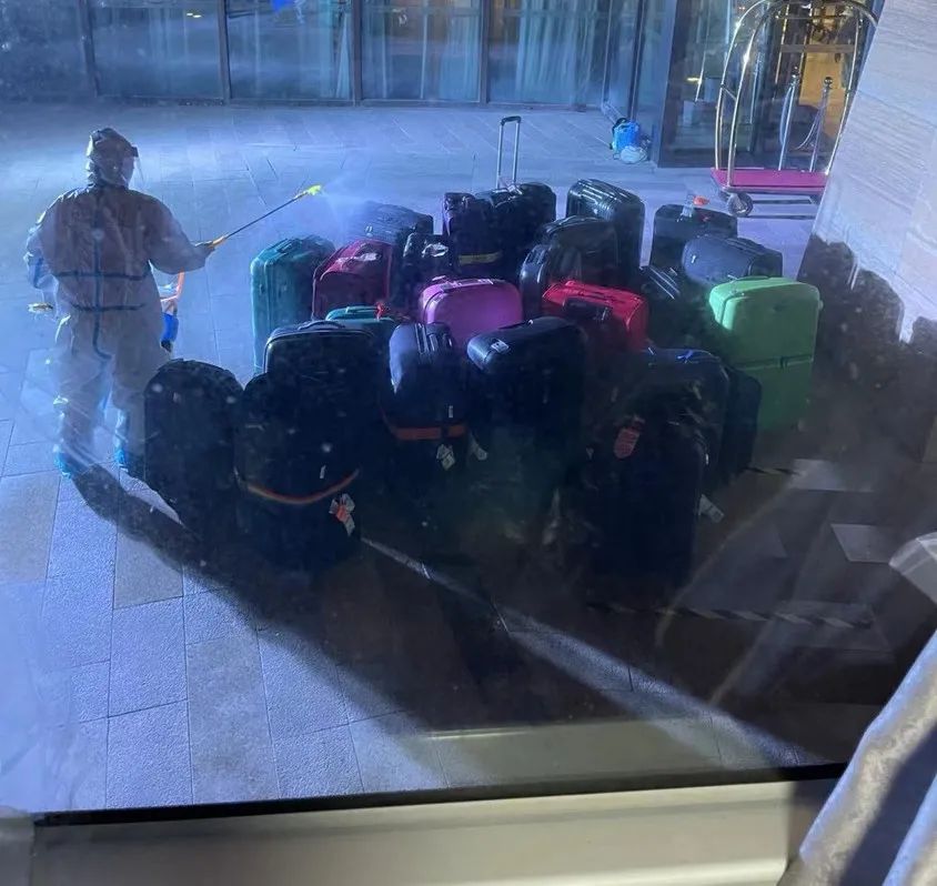 工作人員領着我們去房間,走在酒店走廊裏,前面的人穿着全副武裝的防護服,我們呆呆地拖着隨身行李跟在身後。