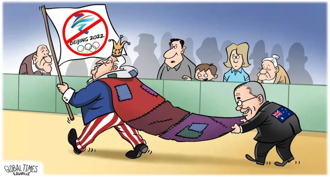 ▲ 美國拒絕聯署北京冬奧會奧林匹克休戰決議,宣稱“外交抵制”北京冬奧會,才是禍害世界和平的毒瘤。而澳大利亞等國甘當侍從,卑微托起美國破爛不堪的披風。(漫畫 | 劉蕊)