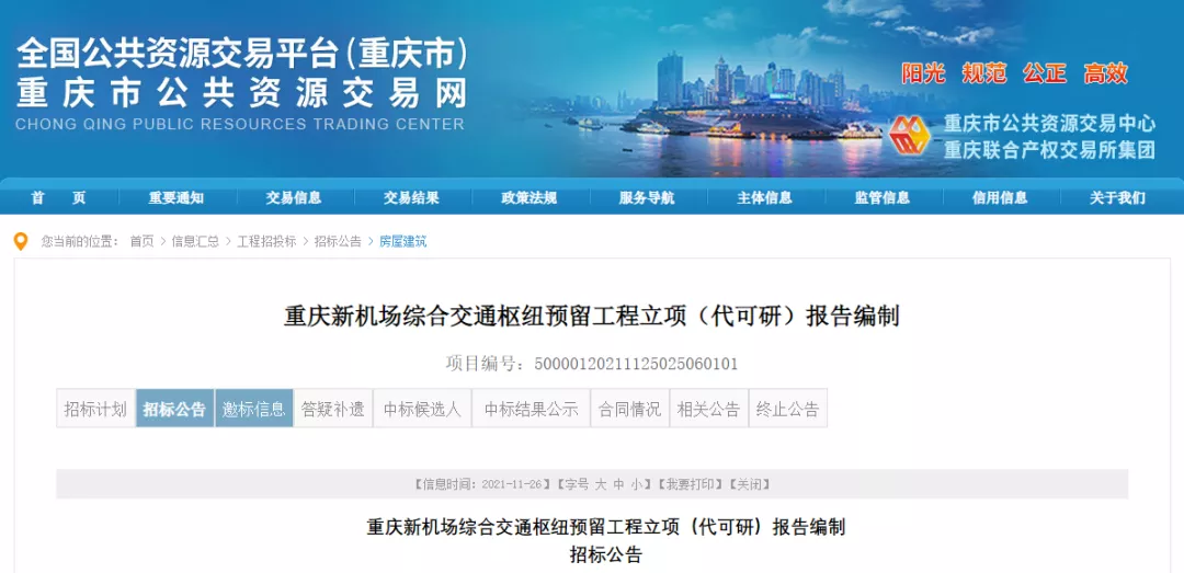 近日,重慶市公共資源交易網發佈《重慶新機場綜合交通樞紐預留工程立項(代可研)報告編制招標公告》(下稱《公告》)。其中透露,重慶新機場項目地址位於“重慶璧山正興鎮和丁家街道範圍內”。同時,公告還提及規劃引入的鐵路、軌道交通具體線路,並要求“重點深入研究與樞紐範圍內的城市軌道交通、鐵路交通的接駁”。