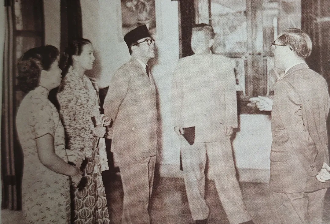 1957年蘇加諾總統和哈蒂妮夫人到黃鎮大使官邸做客,左起第一人為朱霖。(《大使夫人回憶錄》圖)