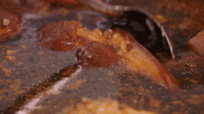 中藥、香料、老滷、五花肉,食材們共同在鍋裏度過漫長的幾個小時,“大火燒開,小火轉燜,水開圓卻不翻浪”,一直煮到肥肉晶瑩剔透、瘦肉嫩而多汁,光是看一眼就令人心神盪漾、靈魂昇華,口水流下三千尺。