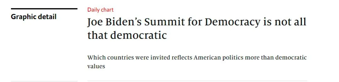 《經濟學人》的文章題目一針見血:《喬·拜登的民主峯會沒那麼民主》,副標題更是指出:邀請哪些國家參與與其説體現民主價值,不如説更反映美國政治。