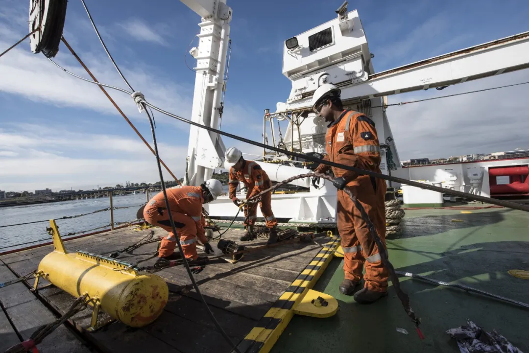 2014年4月14日,鳳凰自主水下航行器(AUV)藍鰭-21被起重機吊在澳大利亞防衞船“海盾號”的一側,正在搜尋失蹤的馬航MH370