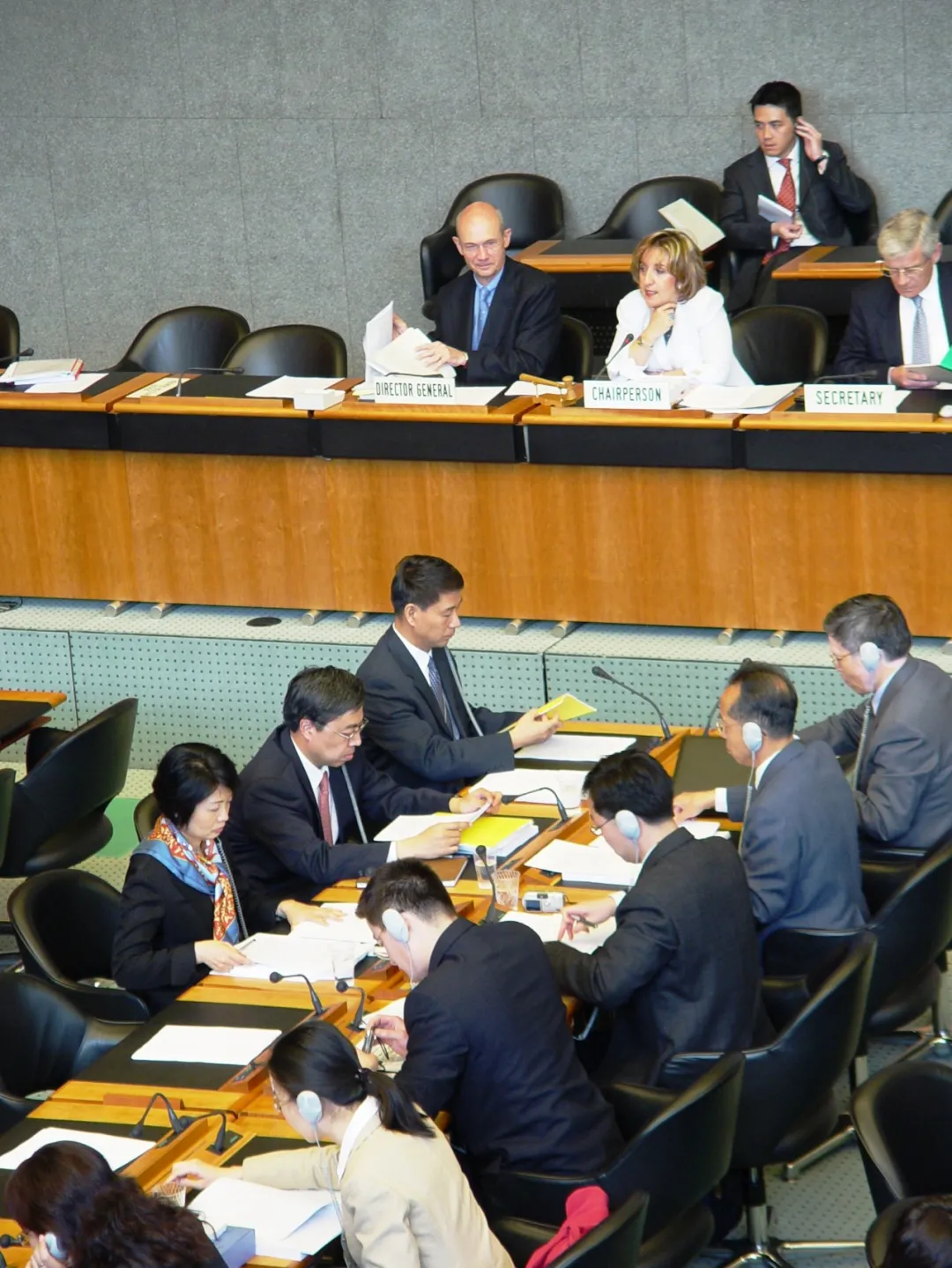 2006年4月,商務部副部長易小準、首任中國駐WTO大使孫振宇、商務部世貿司司長張向晨等參加WTO首次對華貿易政策審議。(受訪者供圖)