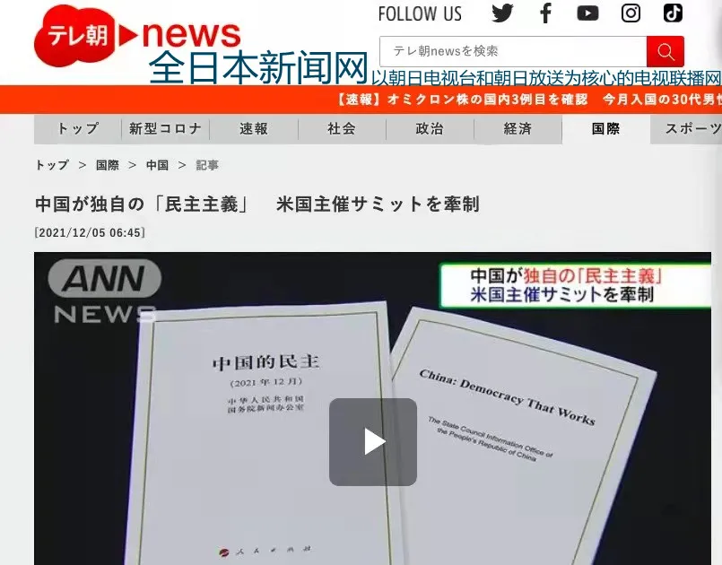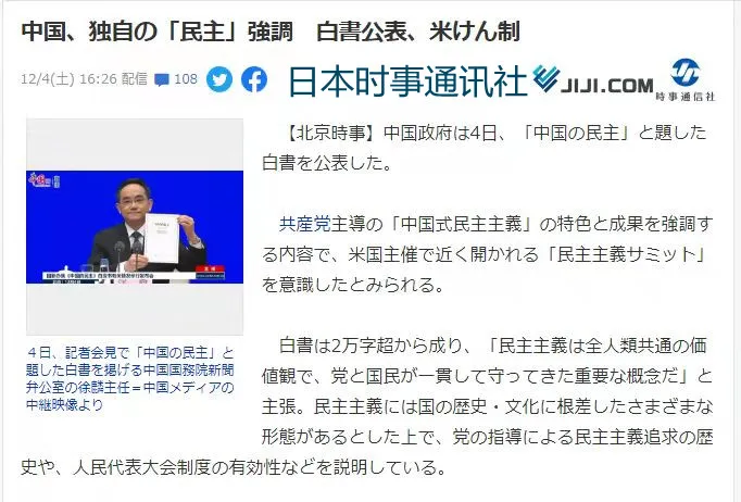 日本《朝日新聞》在報道中國國務院新聞辦公室發佈《中國的民主》白皮書時,援引了國新辦主任徐麟在發佈會上對美國的批評:“個別國家打着民主旗號在世界上煽動對抗與分裂,加劇國際緊張局勢”,白皮書的作用是在美國召開民主峯會之前向世界介紹中國“全過程民主”的概念,強調中國有適合自身國情的民主制度。