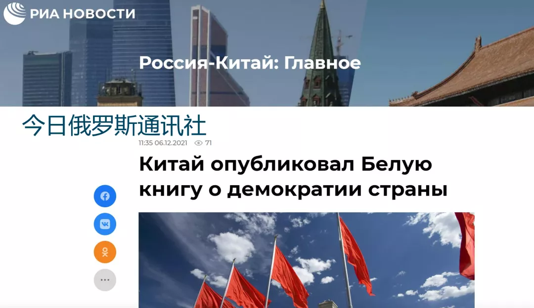 今日俄羅斯通訊社題為《中國發布關於本國民主的白皮書》的報道提到,中國民主的本質是人民當家做主。報道援引《中國的民主》白皮書説,民主是全人類的共同價值,是中國共產黨和中國人民始終不渝堅持的重要理念。100年來,黨高舉人民民主旗幟,領導中國人民實現了人民當家做主,中國人民真正成為國家、社會和自己命運的主人。