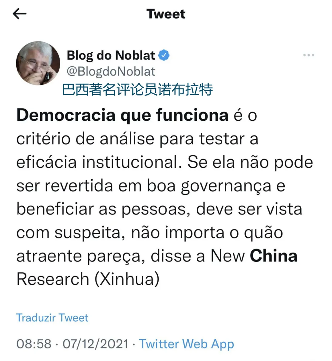 巴西著名評論員諾布拉特在個人的社交媒體賬號上寫道:有效的民主是檢驗制度有效性的標準。他援引了新華社國家高端智庫《全人類共同價值的追求與探索》報告説,如果這種民主不能變成善治、造福人民,無論它多麼有吸引力,都應該被懷疑。有網友在這條推特下留言説:“不幸的是,當今只有兩種類型的民主:1、美國影響不了的,少數。2、美國隨意操縱的,其餘的。”