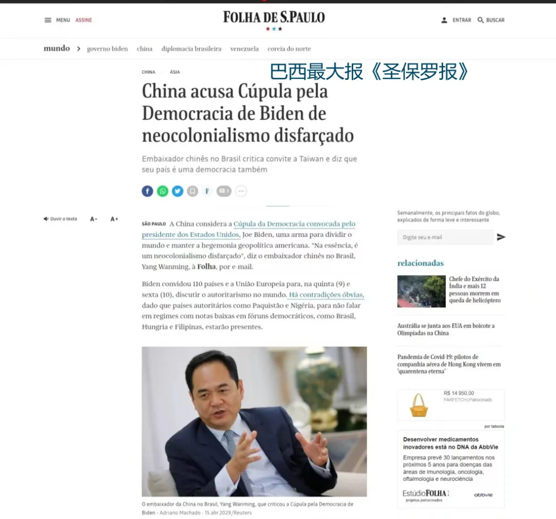 巴西最大報《聖保羅報》刊登了中國駐巴西大使楊萬明的專訪,認為拜登的“民主峯會”是被粉飾的新殖民主義。楊萬明説,美國以“民主領袖”自居,根據自己的好惡決定誰能參會、定義誰是“民主國家”,這本身就是反民主的,打着民主旗號在全球劃分陣營、製造分裂、遏制打壓他國、維護自身霸權,這實質上是披着“民主”外衣的新殖民主義。