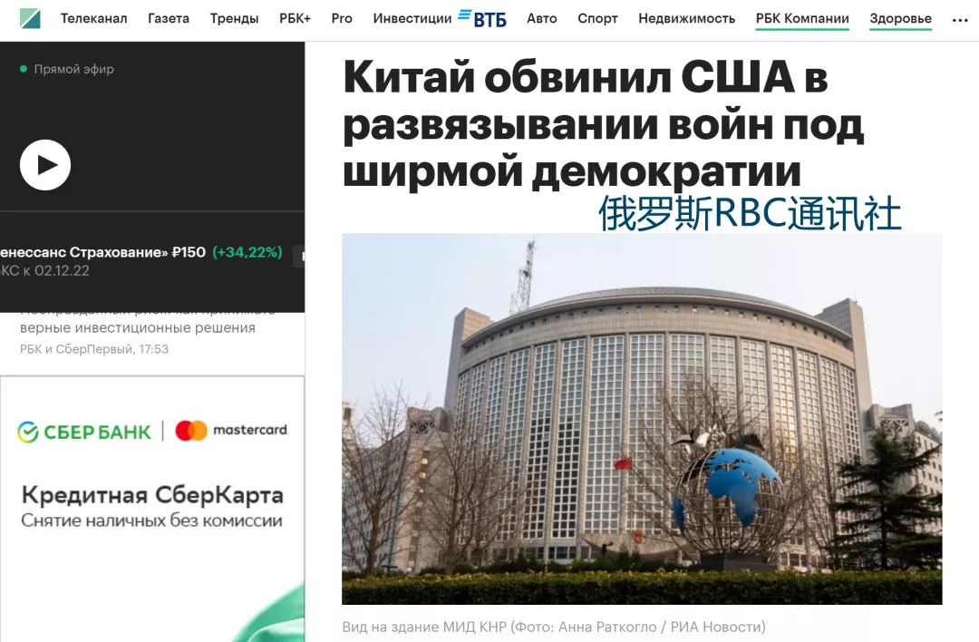 俄羅斯RBC通訊社題為《中國指責美國打着民主的幌子發動戰爭》的文章着重提到美國對外輸出民主造成動盪和災難,文中援引《美國民主情況》報告的內容:美國無視自身民主制度的結構性缺陷與國內民主實踐的不足,自詡為“民主樣板”,頻頻打着民主的旗號肆意干涉他國內政、發動對外戰爭,引發地區動盪和人道主義災難。中國外交部認為,用單一的標尺衡量、或用單一視角看待不同的政治制度,本身就是錯誤。