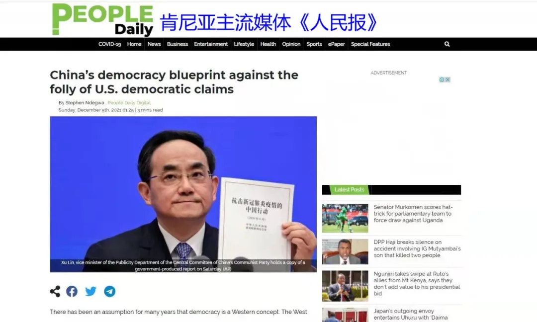 肯尼亞主流媒體《人民報》發表學者恩德格瓦評論文章,高度評價近日發佈的《中國的民主》白皮書和《十問美國民主》報告,讚揚中國的民主是真實的民主,中國共產黨總結歷史經驗,將民主等概念具體化、中國化,是世界上最具遠見的政黨,在較短的時間內帶領中國走向偉大。中國的民主由人民創造、為人民服務,中國共產黨始終密切同人民羣眾的聯繫,凝聚起最廣大人民的智慧和力量。美式民主實則淪為侵犯人權、維護霸權的工具。