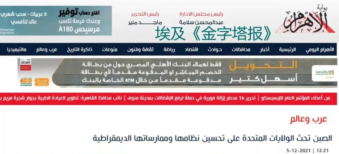 埃及官方《金字塔報》刊發題為《中國敦促美方完善民主制度》的報道,認為中國外交部發布的報告以事實為依據,揭露了美國民主的弊端以及美國對外輸出民主模式帶來的危害及後果。中國外交部強調民主是全人類的共同價值觀,是所有國家的權利而不是少數人的特權,且民主有多種形式。