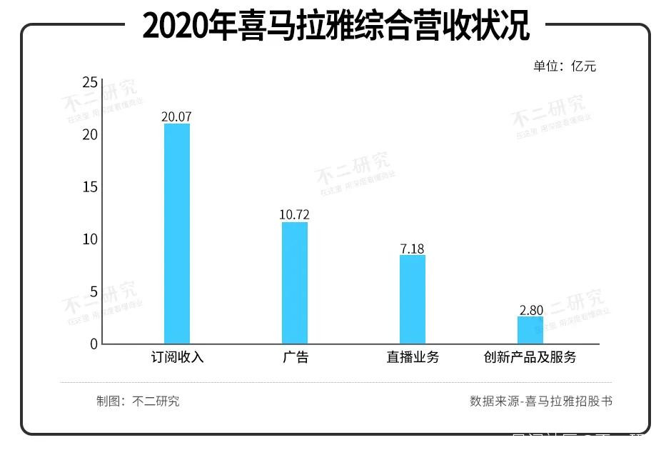 以2020 年喜馬拉雅40.76 億元綜合營收為例,其中訂閲收入20.07億元,佔比高達49.2%;廣告和直播業務分別貢獻了10.72 億元、 7.18 億元的營收,兩者總計佔比43.9%;其他創新產品及服務為2.80 億元。