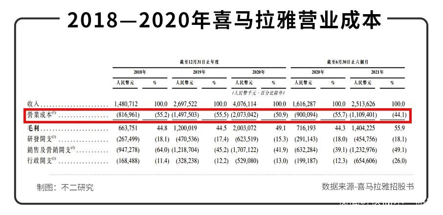 喜馬拉雅招股書顯示,其2020年營業成本為20.73億元,同比增長38.43%;2018-2020年,營業成本佔收入的比重均在50%以上。