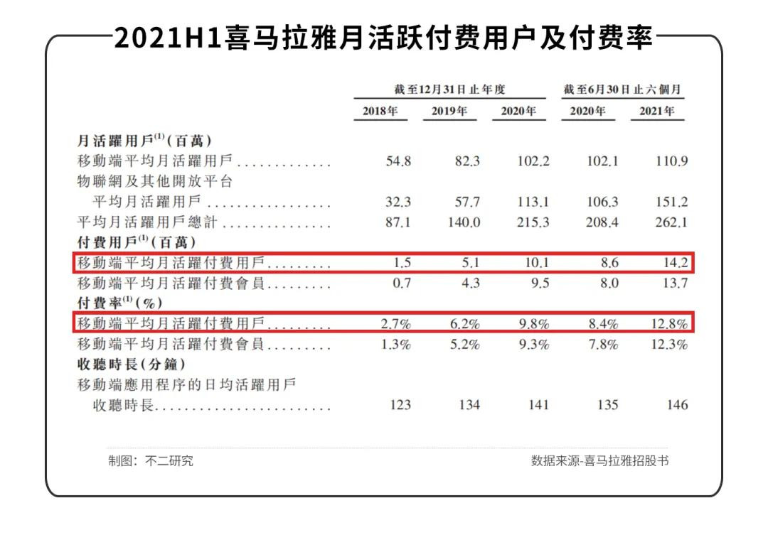 但是,喜馬拉雅的用户付費率不及預期。招股書披露:截止2021上半年,喜馬拉雅移動端平均月活躍付費用户為1420萬人,付費率僅為12.8%。儘管用户付費率有所增長,但並不能彌補高收入成本帶來的虧空。
