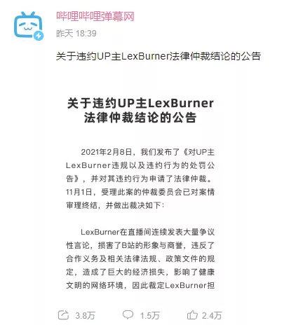 昨天 Bilibili 官方發佈了一則公告,內容是關於之前被封禁的 “ 違約 UP 主 ” LexBurner 的法律仲裁結論。