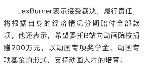 同時,LexBurner 本人還捐出 200 萬元,委託 B 站捐給動畫院校,扶持中國動畫人才培育。