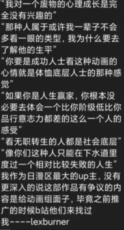 當時 LexBurner 在直播中點評了一下當季的新番《 無職轉生 》,這沒啥問題,畢竟是動畫區老牌 UP 主,雖然是轉型了,也不能把老本行落下。