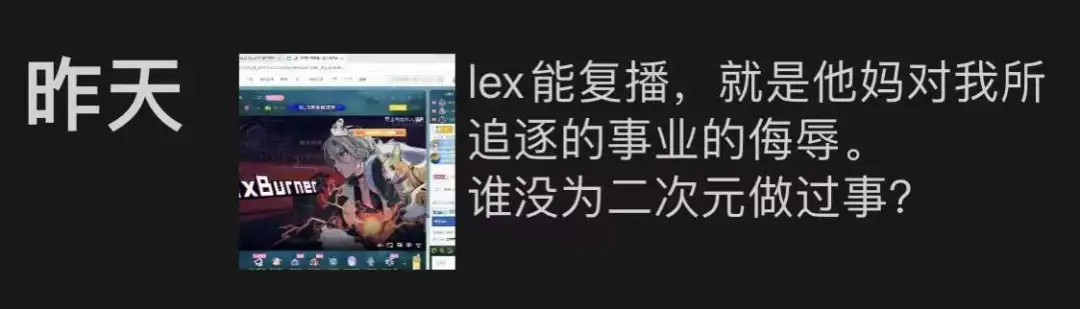 我的一名 ACGN 相關從業者朋友甚至在朋友圈直言,LexBurner 能復播就是對他追逐的事業的侮辱。