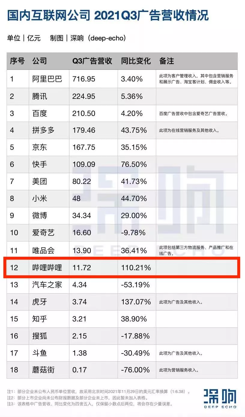 一片哀嚎中,倒是拼多多、京東、小米、B站等公司的廣告板塊呈現出增長。尤其是B站,在主流互聯網公司中難得地實現了三位數的增速。