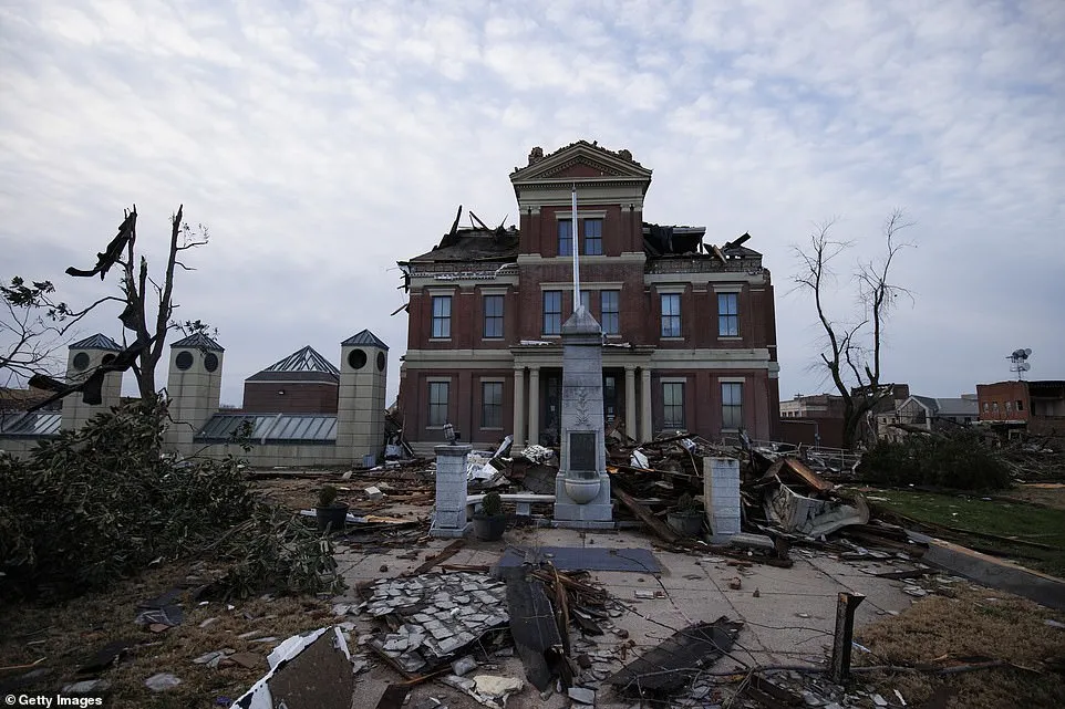 位於肯塔基州梅菲爾德的格雷夫斯縣法院被完全摧毀。肯塔基州應急管理協會發布的圖片顯示,法院大樓的頂部被刮掉了。