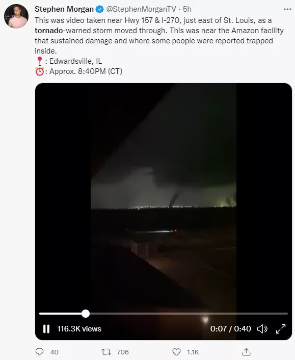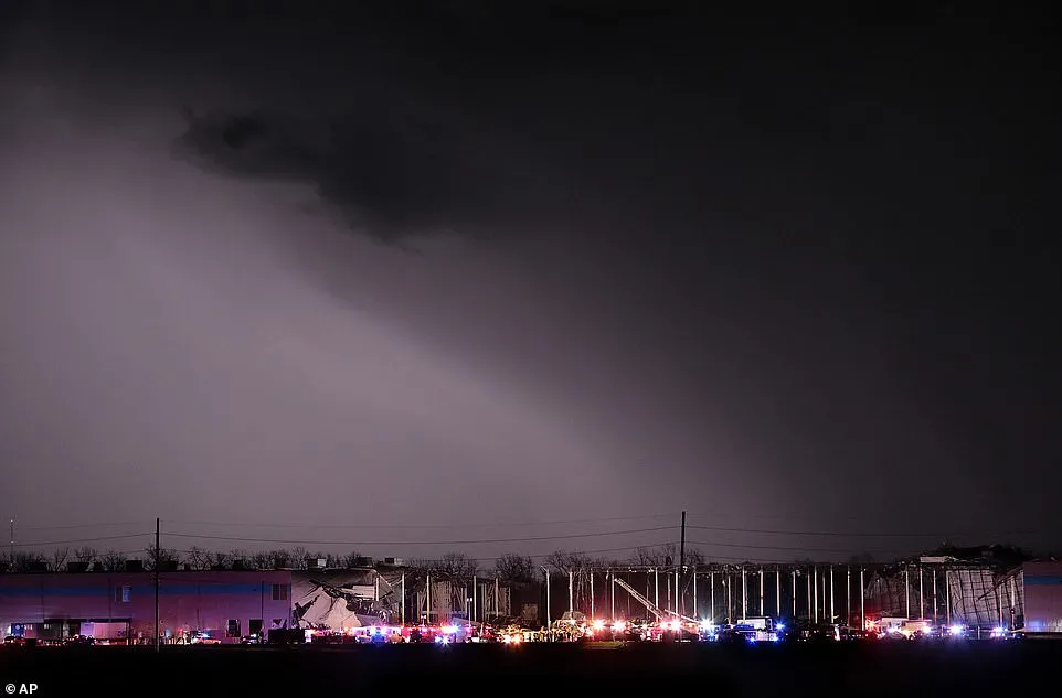 除了受災最嚴重的肯塔基州,國家氣象局週五晚上發佈了包括阿肯色州、田納西州、密蘇里州和伊利諾伊州在內的幾個州的龍捲風警報。