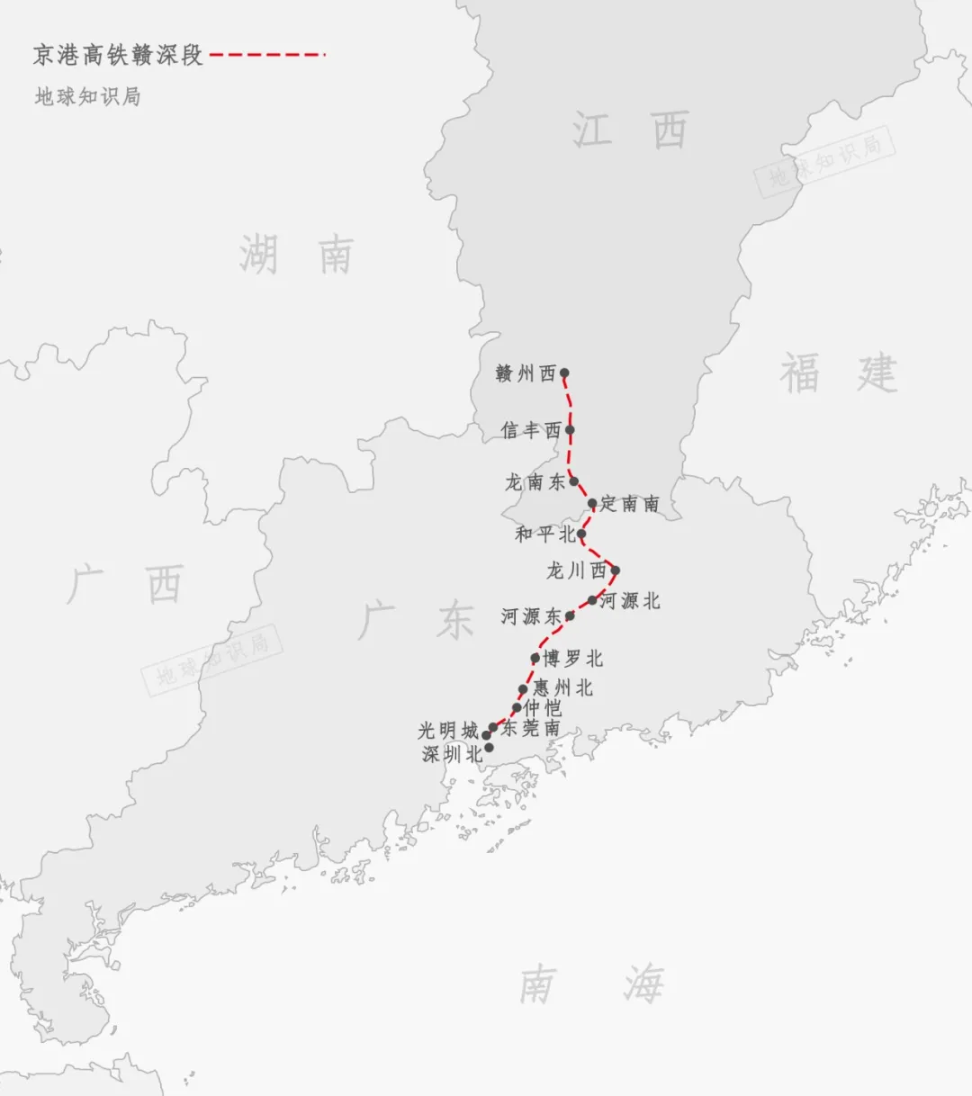 贛深高鐵,北起江西省贛州市,南至廣東省深圳市:途經江西省贛州市南康區、章貢區、信豐縣、全南縣、龍南市、定南縣,廣東省河源市和平縣、龍川縣、東源縣、紫金縣、源城區,惠州市博羅縣、惠城區,東莞市,深圳市光明區、寶安區、龍華區。