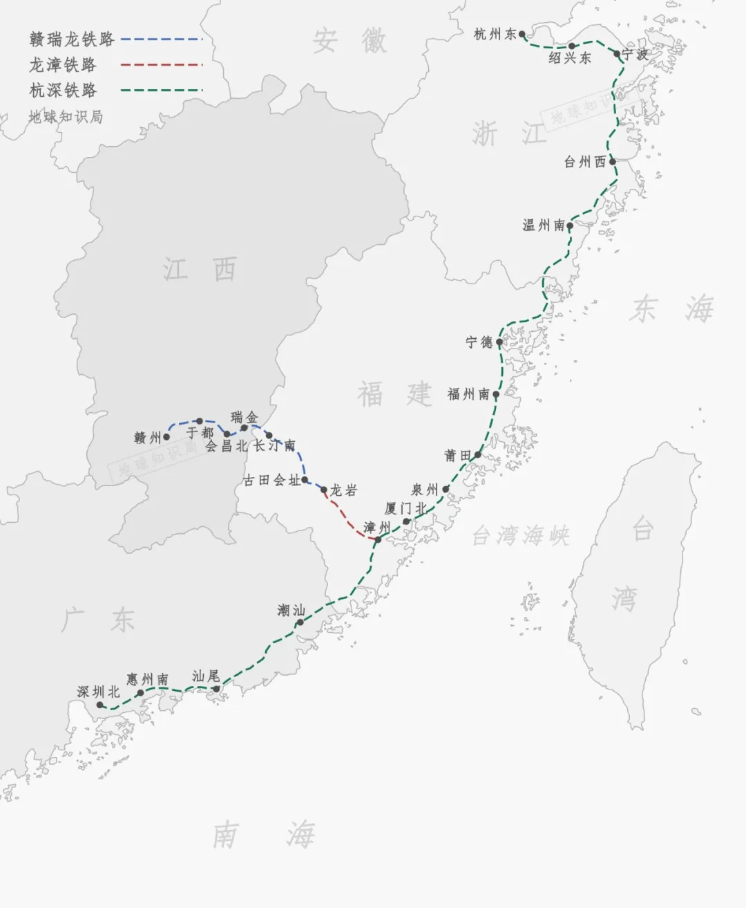 由贛州到深圳的高鐵動車線路只有一種,且需要繞行福建:由贛瑞龍鐵路+龍漳鐵路+杭深鐵路所組成。