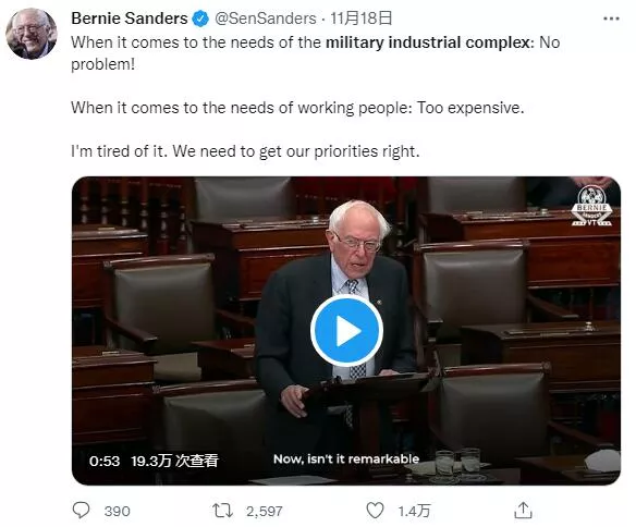 被稱為美國“進步派”領軍人物的伯尼·桑德斯上個月也在參議院的辯論中公開反對今年的國防授權法案。他説:“當談到軍工複合體的需求時:沒有問題。當談到勞動人民的需求時:太貴了。我受夠了這些。”
