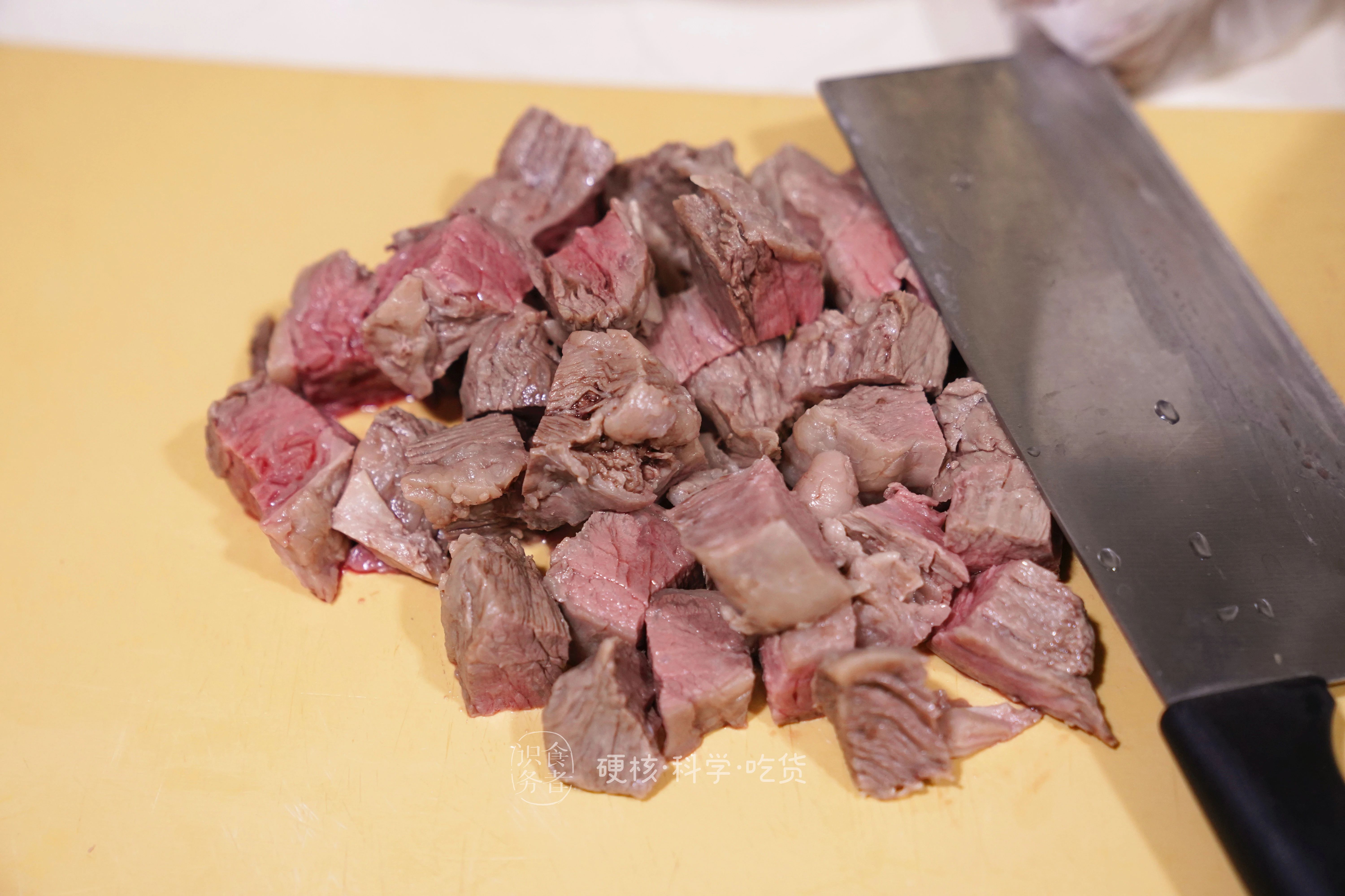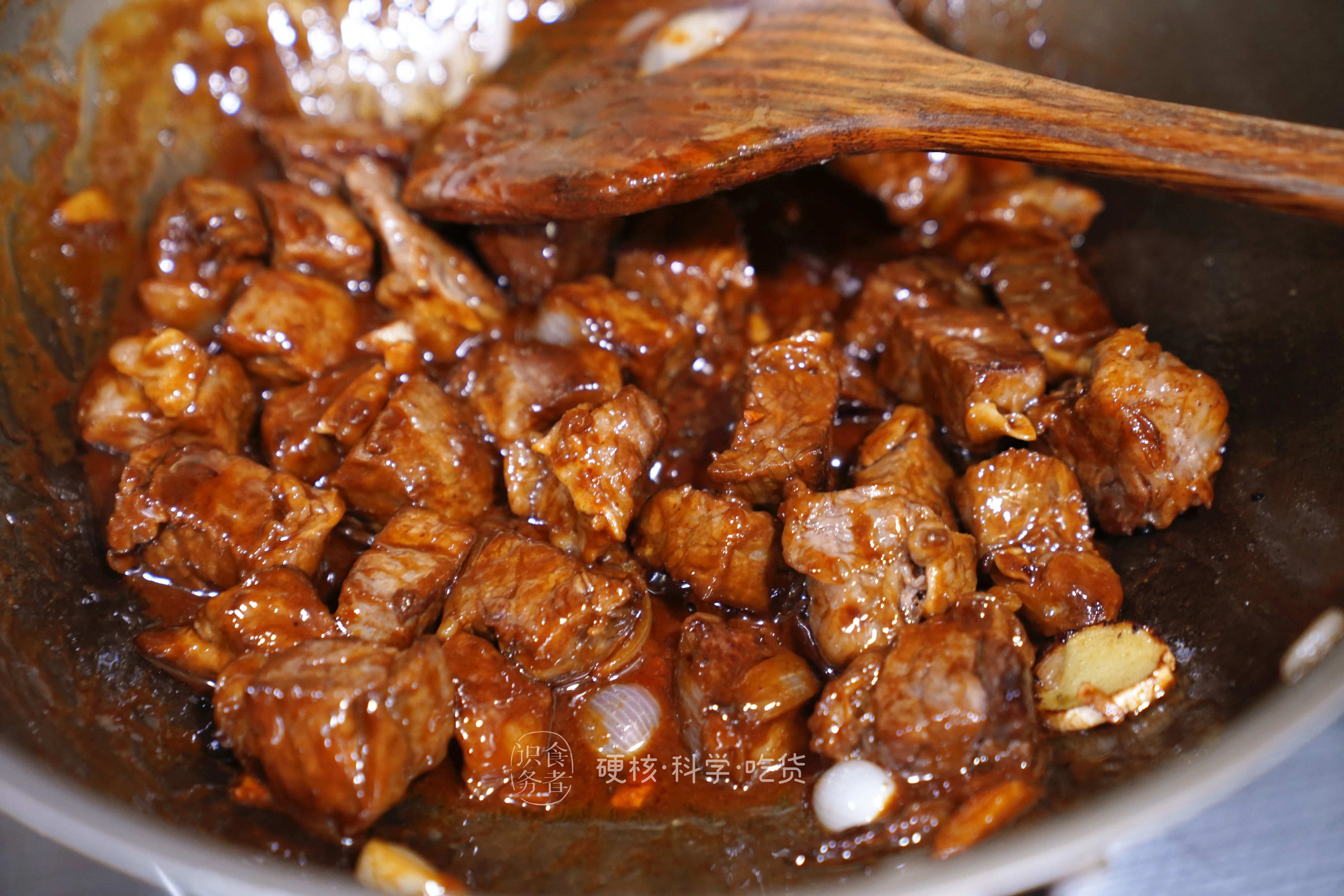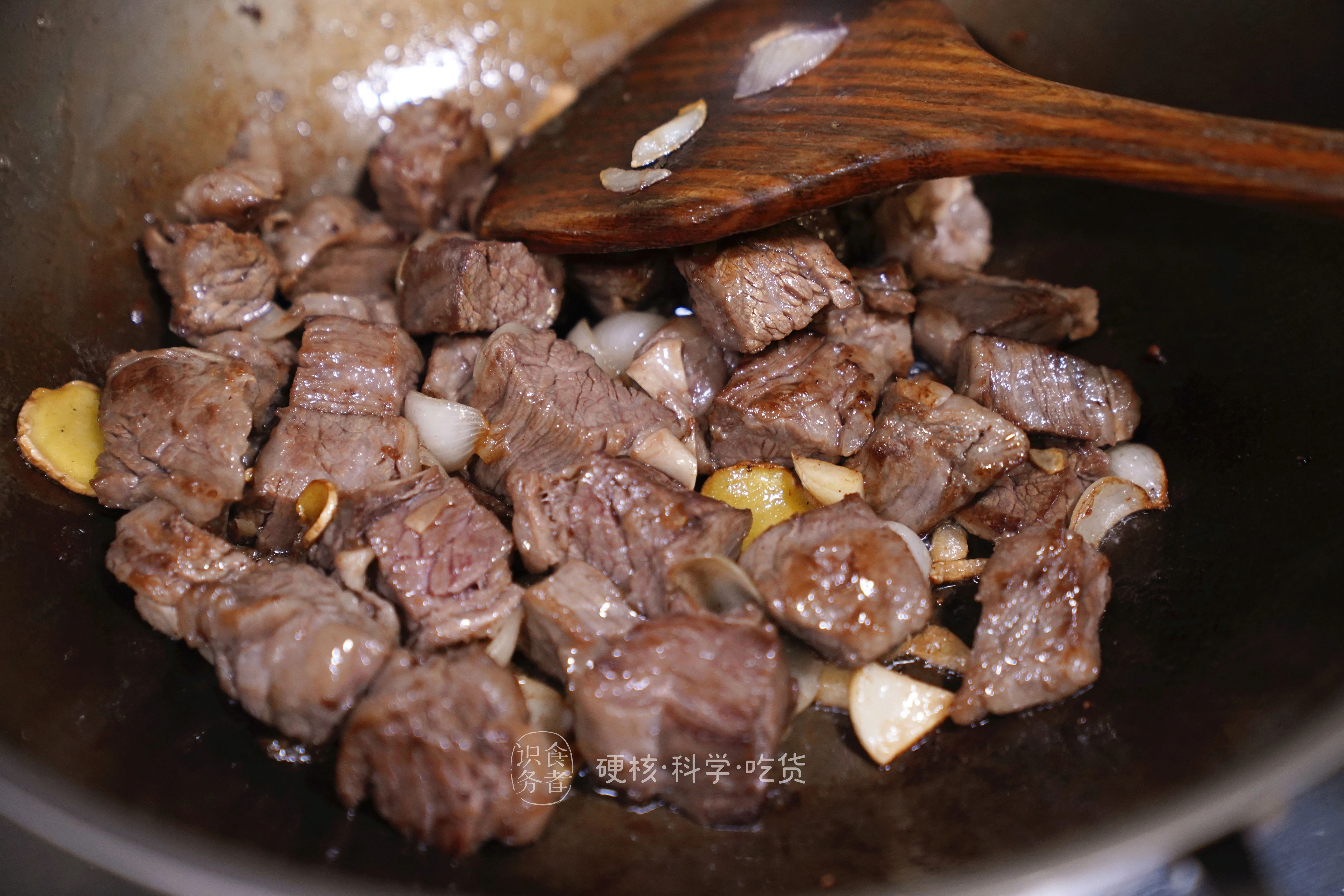 倒入切粒的牛腩入鍋翻炒至表面有明顯的肉焦香風味(類似你煎牛排那種味道)