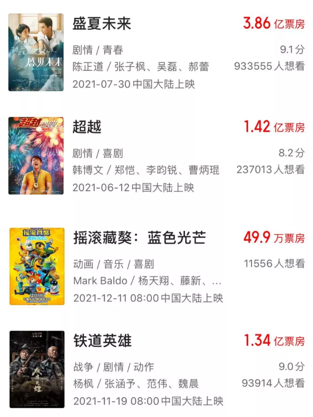 五大中的吊車尾是華誼。去年靠《八佰》風光救市,今年拿得出手的成績只有《盛夏未來》。但按照其宣發體量,加上抖音的深度植入,票房卻僅收3.89億,充其量只能回本。華誼主出品的其他片全軍覆沒,比如張涵予、範偉主演的《鐵道英雄》僅收1.34億票房,鄭愷主演《超越》1.42億,動畫片《搖滾藏獒:藍色光芒》只有41萬票房。