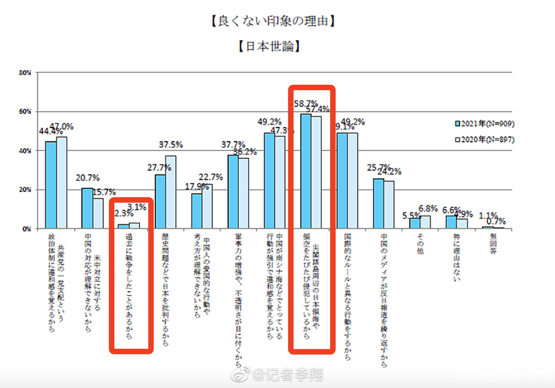 在問卷中説到為何持負面原因(多選)?中國民眾選擇最多的就是日本對中國的侵略歷史,高達77.5%,這也是從開始做調查至今始終排名第一的選項,排名第二的就是釣魚島問題,高達58.7%。但令人擔憂的是日本的對中國負面情緒始終在90%以上,而選擇的負面原因是兩國有二戰戰爭歷史僅僅為2.3%,選擇最高的選項是釣魚島問題58.7%。