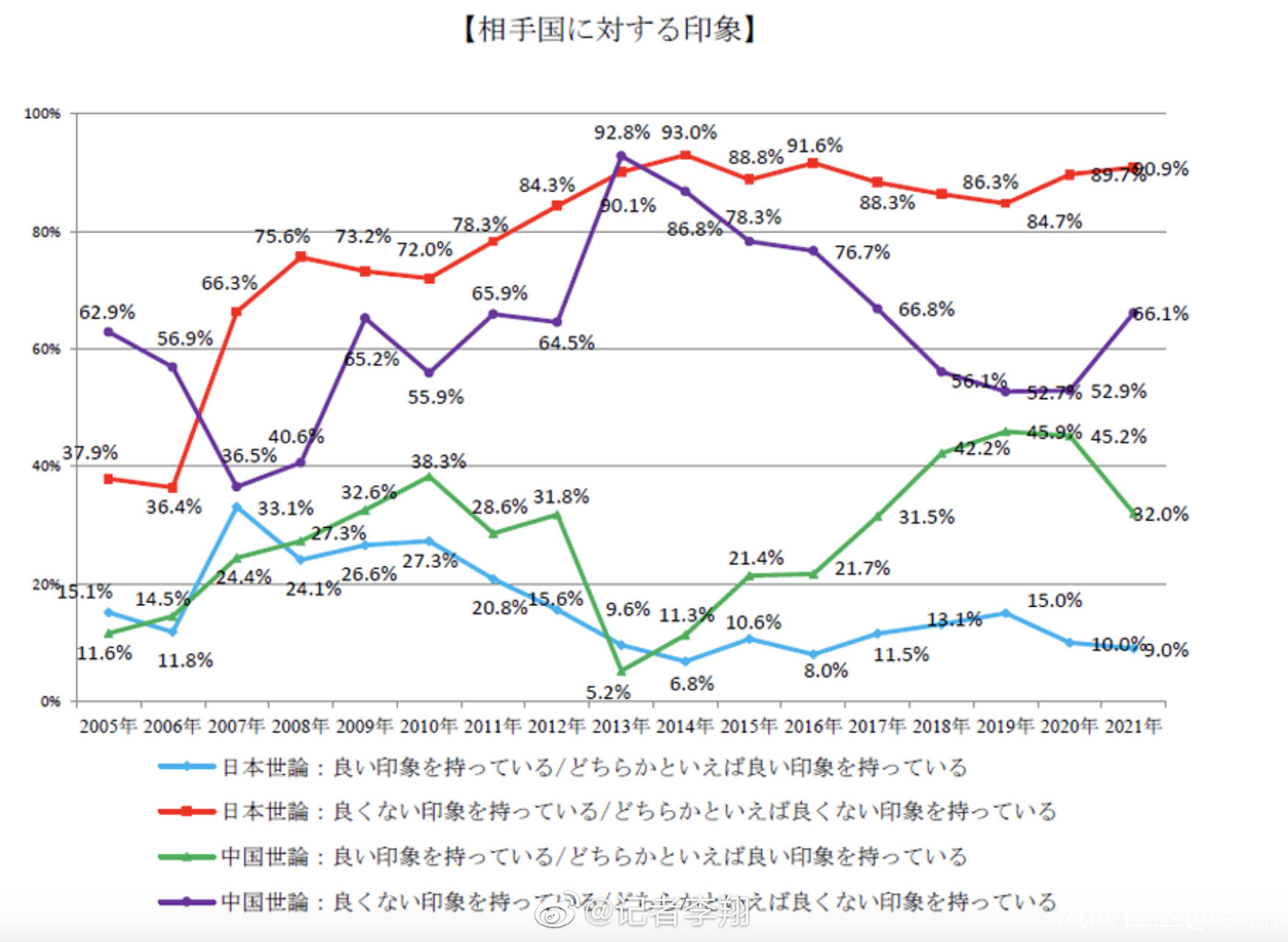 我每年都會關注一份來自於中國和日本的NPO組織做的民調報告,這份報告的民調非常詳細,今年的報告顯示中國對日本的負面情緒高達66.1%,近六年來首次增長,這也看出近6年的逐漸回暖的中日關係在中國出現了拐點。