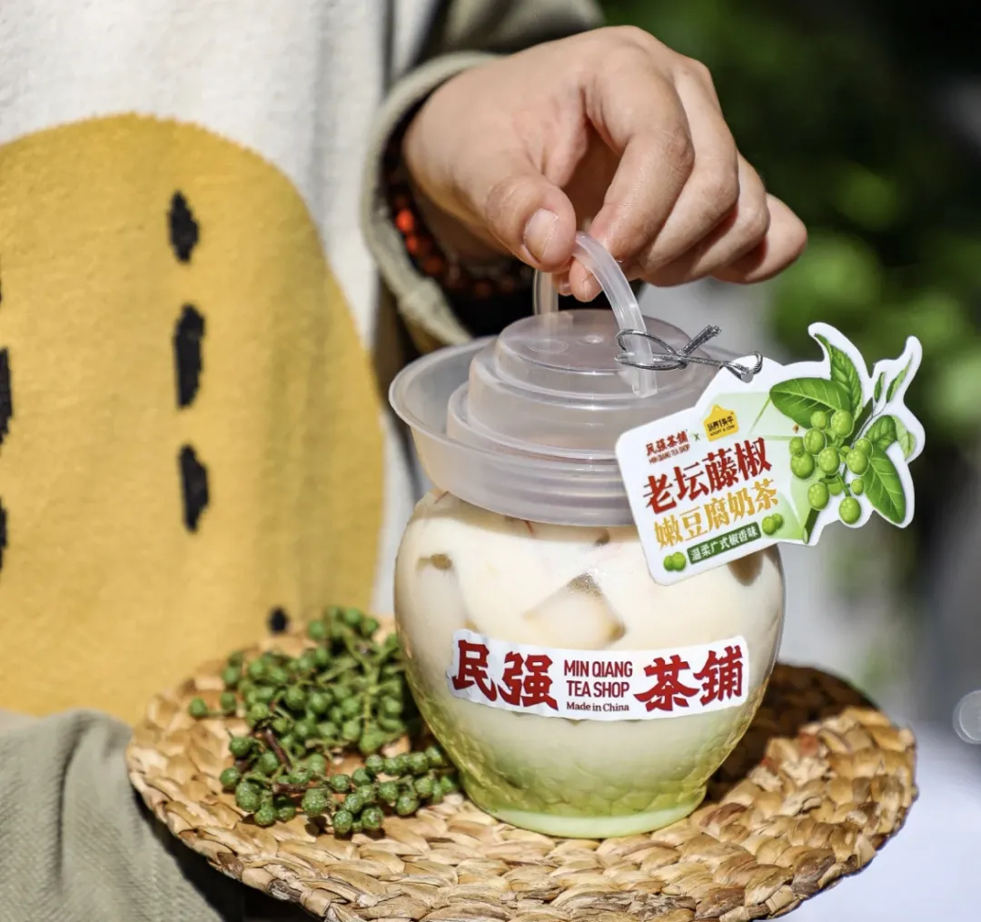 近日,民強茶鋪與認養一頭牛聯名,推出“老壇藤椒嫩豆腐奶茶”,這款奶茶用透明壇裝,“老壇“與奶茶的結合十分獨特,創意感拉滿。