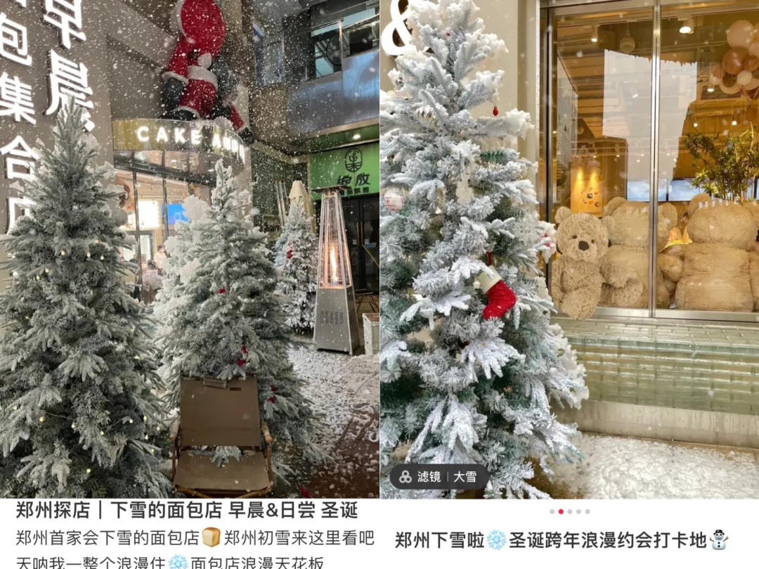鄭州一家名叫早晨&日常的麪包集合店,則是為消費者造了一場雪景。