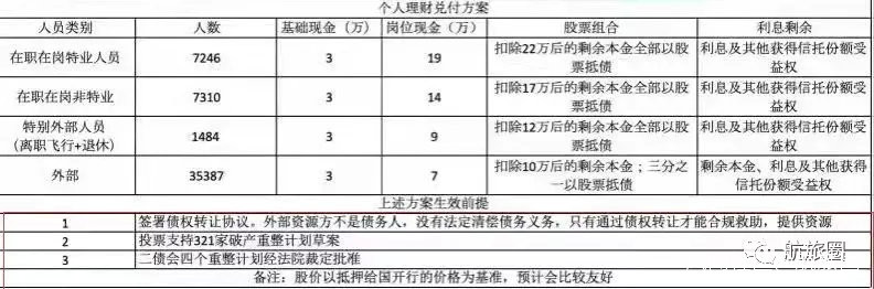 比如海航在職員工的特業人員可以獲得的全現金兑付是22萬(3萬的重整清償現金+19萬的救助清償現金),非特業人員是17萬(3萬的重整清償現金+14萬的救助清償現金),外部理財人是10萬(3萬的重整清償現金+7萬的救助清償現金),剩餘本金和利息的股票抵債規模也不盡相同,用於抵債的股票是海航三家上市公司(*ST海航,*ST基礎,*ST大集)的股票。