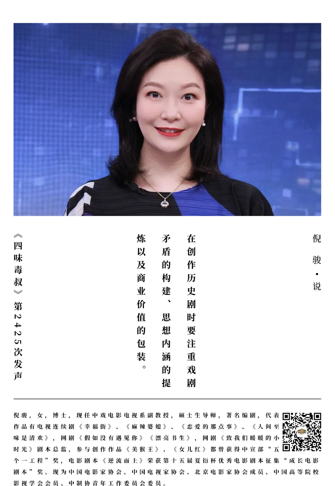 我們在創作歷史劇的時候,要注重戲劇矛盾的構建、思想內涵的提煉以及商業價值的包裝。現在還是有傳統文化的熱度,包括年輕人喜歡的國潮和國風,包括影視和文旅的聯動,比如説《長安十二時辰》的出現讓西安就火了,它有很多影視劇集,所以實際上是能夠帶動影視文旅的,包括《風起洛陽》也讓洛陽馬上就要成為網紅城市。如何做好歷史劇,第一,在題材上踏踏實實的來做;第二可以像九州系列那樣來懸浮的戲;第三,注重文旅的聯動。我覺得這樣就會有更多的反響。感謝大家收看這一期的《四味毒叔》,我們下期再見。