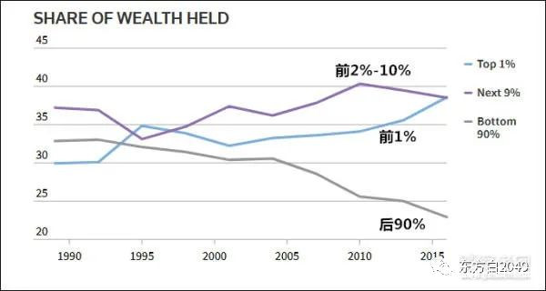 以下,是一張美國1%的富豪、2-10%的富人和90%的窮人財富佔比走勢圖,很明顯在普選後,美國大富豪的財富佔比的趨勢越來越高,而且呈加速上行的狀態!
