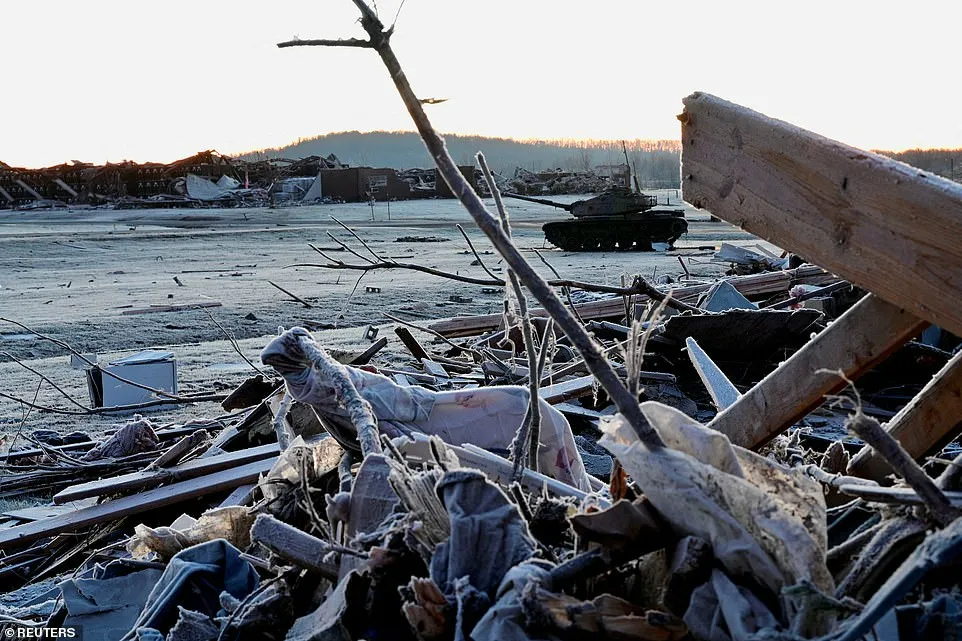 整個街區被夷為平地,房屋和建築物被撕成碎片,扭曲的金屬、破碎的樹枝和磚塊散落在街道上。
