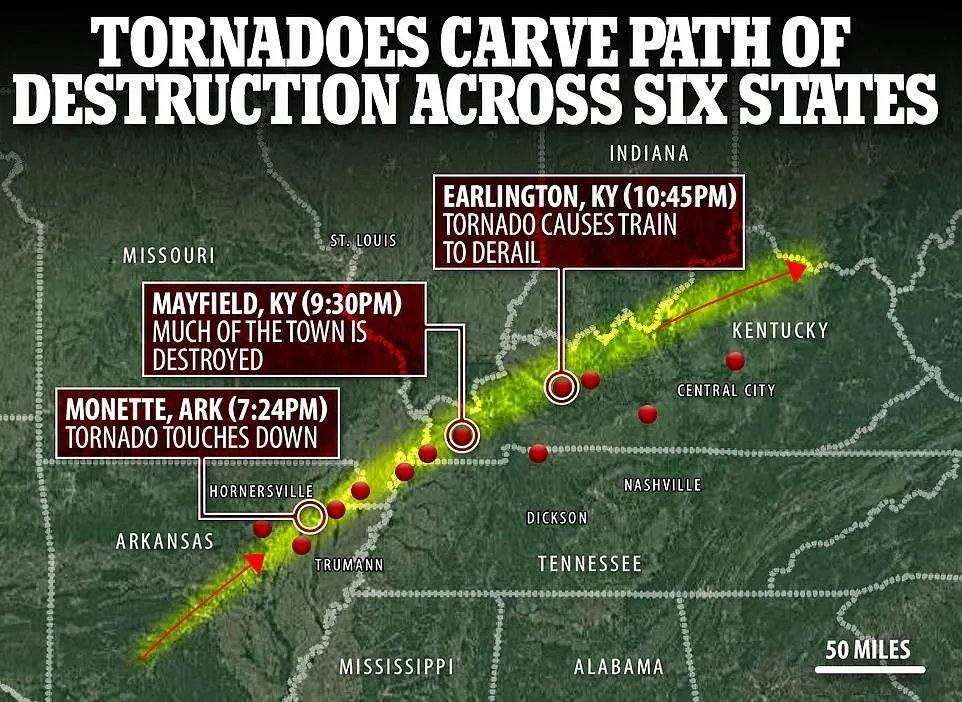 此次風暴的中心位於肯塔基州西部偏遠地區的梅菲爾德鎮(Mayfield),該鎮人口約1萬人,位於藍草州(Bluegrass State)與伊利諾伊州、密蘇里州和田納西州接壤的地方。