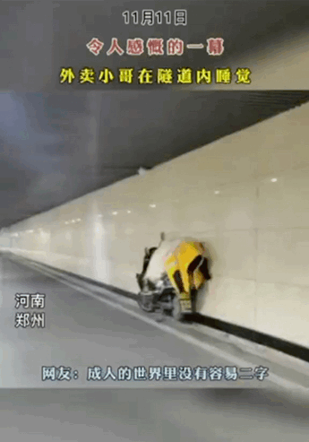 ▽凌晨2點,河南鄭州的某個隧道,一外賣小哥正躺在電瓶車上睡覺。剛經歷過洪水、疫情的衝擊,所以更加珍惜現在的工作。短暫休息後,他還是會元氣滿滿地踏上為生活而奮戰的路。