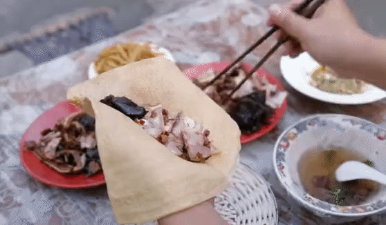 就着煎餅一口下去,邊吃湯汁邊化開,融進酥嫩的豬肉片,