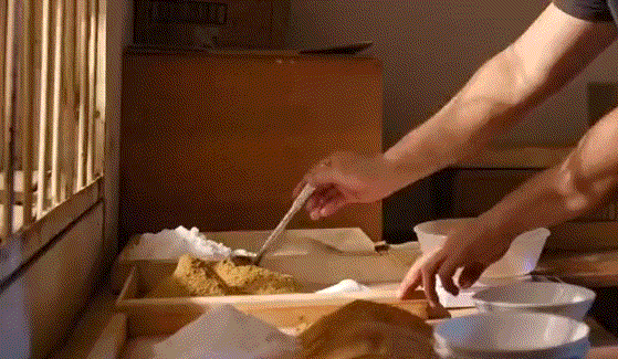 將米餅置於炭火之上,慢烤至微微膨脹,錶殼與內部分離。