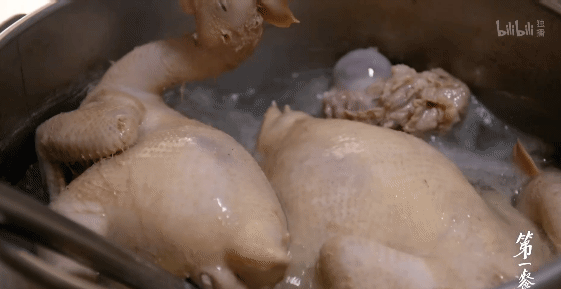再將雞去骨,雞皮剝下,滾入濃湯中;
