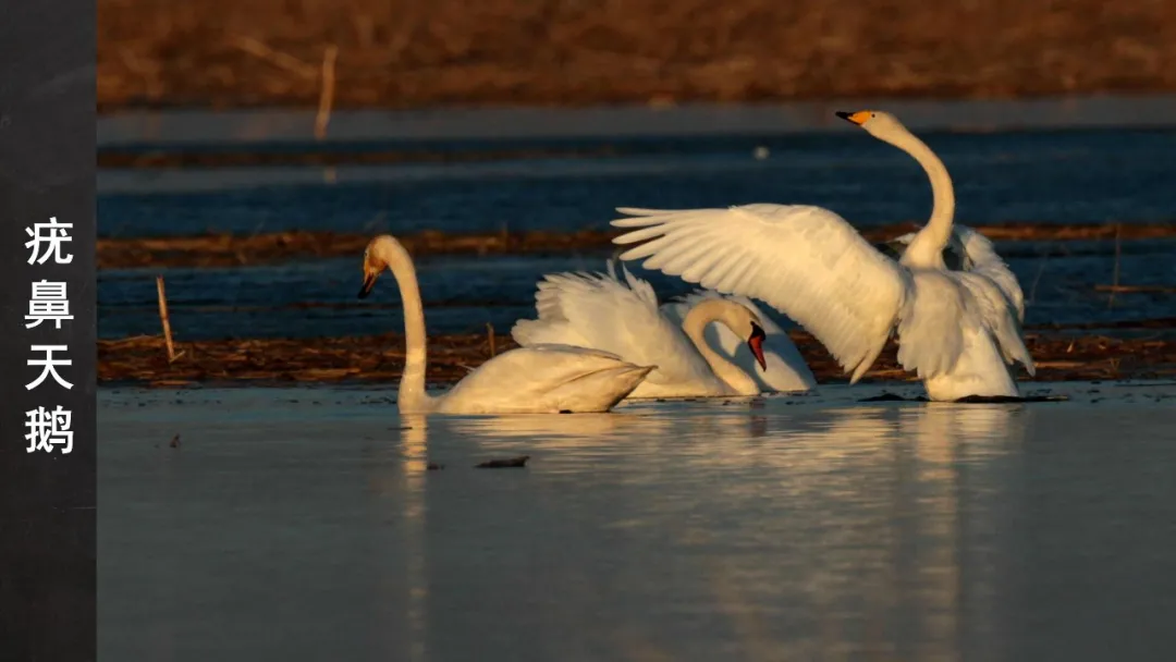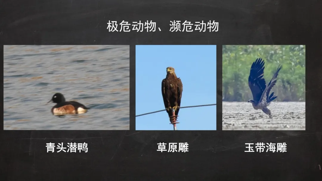 大家從這張照片中就可以清晰地看出來,我們還欣喜地在烏梁素海發現了極危的動物青頭潛鴨,同時瀕危的草原雕、玉帶海雕也回來了,我們也可以看到疣鼻天鵝和鳳頭鸊鷉,這些保護動物在烏梁素海戲水的場面。